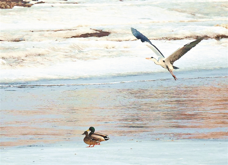 鳥兒在融化的江面嬉戲。朱紹翎攝