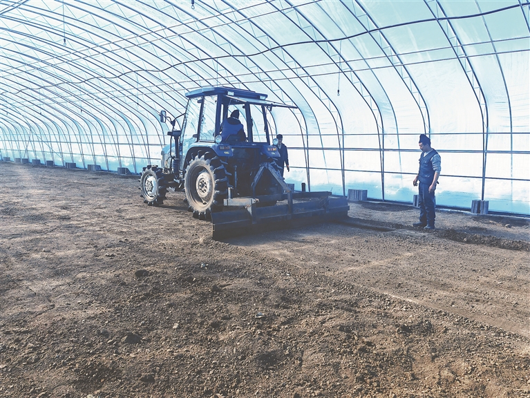 在第二管理區(qū)大棚基地內(nèi),種植戶冷德錄正和幾名種植戶通過戶間合作的方式進行平床作業(yè)?!霸瓉砦覀兪侨斯て酱?,3個人用4個小時才能平完一棟大棚,費時費力?,F(xiàn)在用平床機,1個小時就能平完,效率高了,作業(yè)標準也高了?!崩涞落浾f。