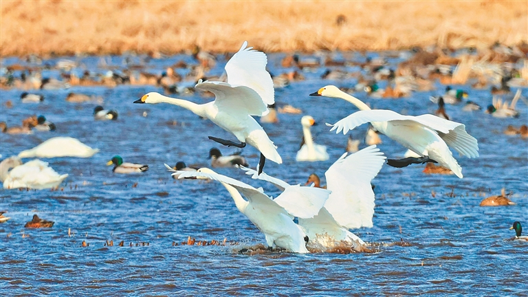 圖為候鳥在興凱湖上飛舞嬉戲。周軍攝
