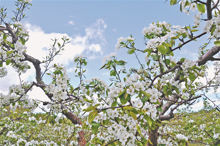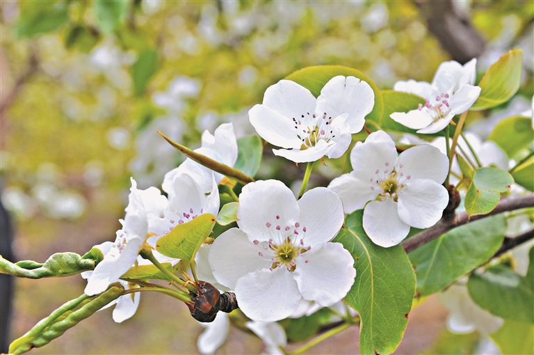 一場(chǎng)小雨過后,花瓣上、樹葉上一滴滴晶瑩剔透的水珠給梨樹增添了幾分韻味,梨花帶雨,讓人又憐又喜。漫步梨園,樹上朵朵梨花如雪,地面蒲公英花金黃,頭頂是湛藍(lán)的天空和朵朵白云,一只只繁忙的小蜜蜂在花間“起舞”。漫步其中,仿佛游走于一幅畫卷中,讓人只想留住這美麗的瞬間。