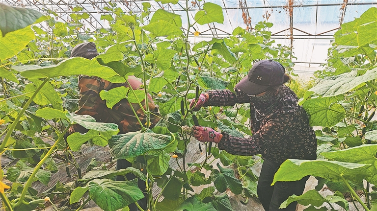工作人員正在大棚里采收水果黃瓜。本報(bào)記者 李健攝