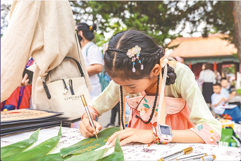 本報(bào)10日訊(記者 董云平)對(duì)古詩(shī)摘“高粽”香囊、體驗(yàn)古風(fēng)花鈿、沐蘭湯凈手、粽葉寫(xiě)祝福、解鎖端午限量印章、領(lǐng)取端午彩絲……10日,省民族博物館融合傳統(tǒng)習(xí)俗與現(xiàn)代創(chuàng)意,開(kāi)啟沉浸式“端午文廟行:粽情畫(huà)意 古韻新體驗(yàn)”,多彩傳統(tǒng)民俗、非遺文化將活動(dòng)現(xiàn)場(chǎng)節(jié)日氛圍感拉滿(mǎn),帶給大家端午出游“新”體驗(yàn)。