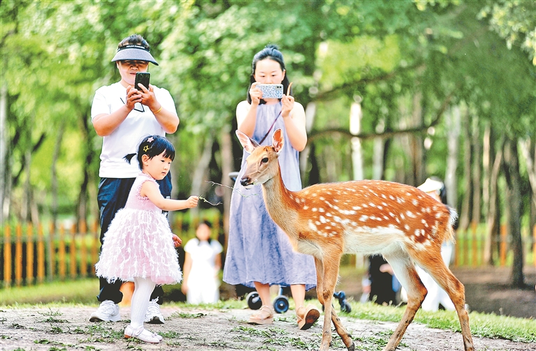 16日,陽光明媚,空氣清新,哈爾濱市迎來了好天氣。太陽島上,草木茂盛,百花爭艷,許多本地市民和南方游客組團來到這里避暑游玩。有的游人搭起帳篷野餐,有的游人走上濕地棧道觀賞美麗風景。孩子們玩過各種游樂項目后,再與小鹿、松鼠等小動物來個親密接觸。