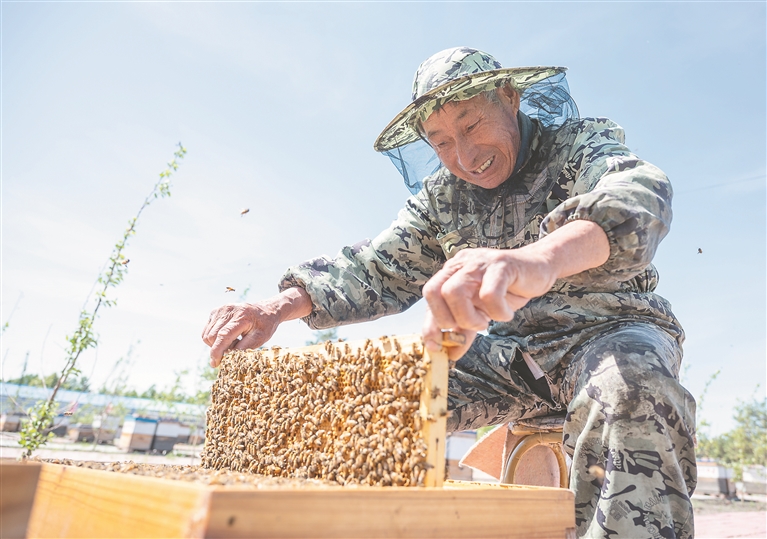 盛夏,草木蔥蘢、百花盛開(kāi),正是蜜蜂采蜜的好時(shí)節(jié)。走進(jìn)齊齊哈爾市克東縣東興林場(chǎng),上百箱規(guī)格統(tǒng)一的木質(zhì)蜂箱整齊排列,蜂箱周?chē)?,勤勞的蜜蜂們正忙碌地搬運(yùn)著甜蜜果實(shí),發(fā)出嗡嗡的聲響。