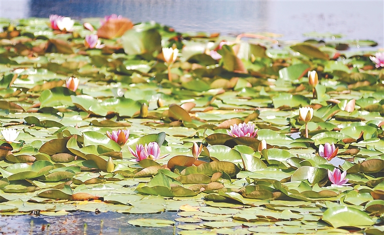 時下,位于哈爾濱市道里區(qū)的群力丁香公園人工湖內(nèi),大片的睡蓮競相綻放,吸引眾多市民和游客前來觀賞拍照。這些睡蓮花朵有白色的、粉色的、紅色的,驚艷綻放,美在當“夏”。