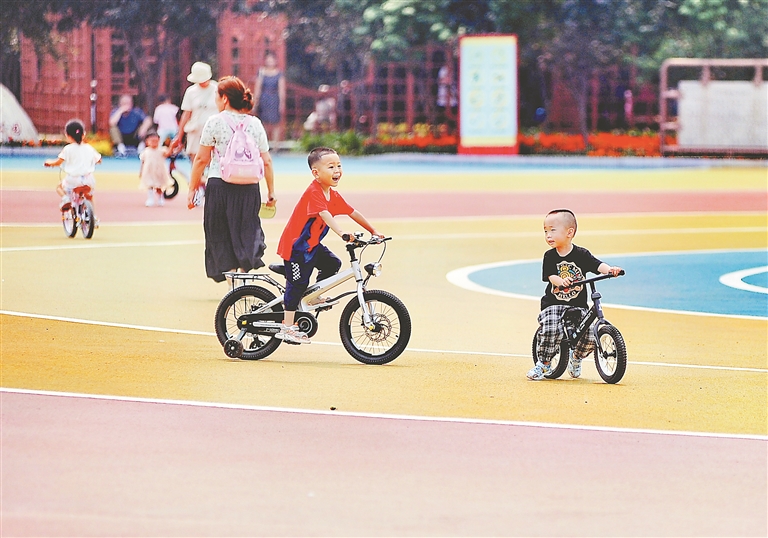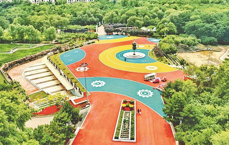 公園內(nèi)4000多平方米的休閑廣場(chǎng),經(jīng)過(guò)改造、彩化,呈現(xiàn)出全新的面貌,孩子們?cè)谏厦骝T車(chē)、奔跑。彩色廣場(chǎng)將工業(yè)主題元素融入設(shè)計(jì)理念,與周?chē)木坝^小品相得益彰。