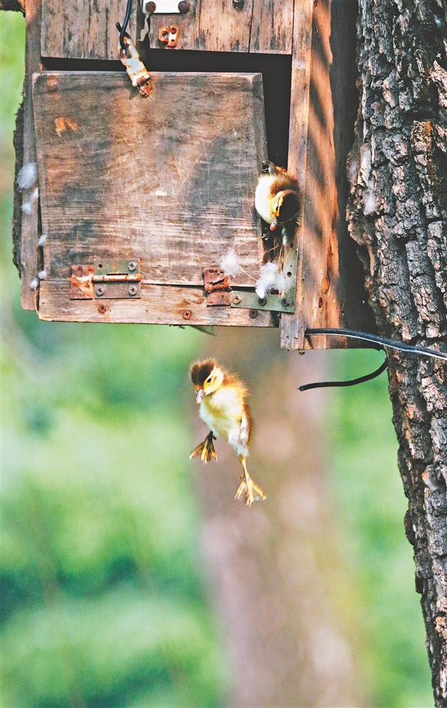 當(dāng)13只小鴛鴦跳完,最后一只卡在木頭縫隙中遲遲下不來,鳥媽媽帶著其他孩子在鴛鴦池塘上焦急地向巢上眺望,不時發(fā)出“咳、咳”的叫聲,召喚它快些跳下來。在一番“手蹬腳刨”后,這只身體有些單薄的小家伙終于掙脫而出,飛身躍到池塘邊的臺階上,然后再躍身跳到池塘里游到媽媽身邊。