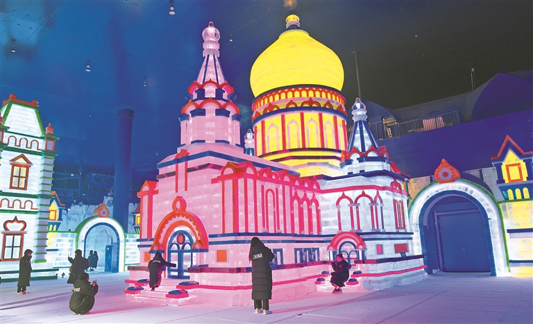 游客在伏天里走進(jìn)哈爾濱冰雪大世界夢幻冰雪館,穿著厚厚的外套,打卡一座座美輪美奐的冰雕雪塑,體驗(yàn)-12℃的浪漫。據(jù)工作人員介紹,自夢幻冰雪館開館以來,前來參觀的游客眾多,換衣處一直處于排隊(duì)狀態(tài),人數(shù)最多時(shí)要排出近百米。