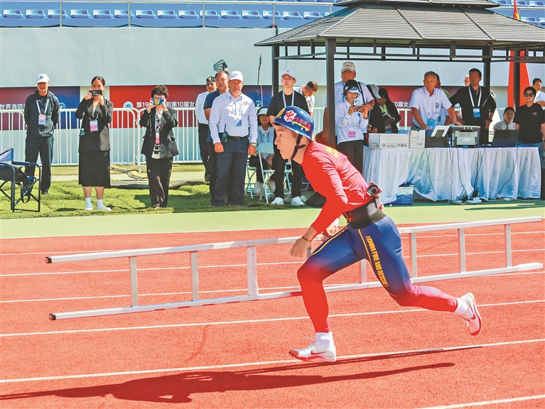 本報9日訊(記者蔡韜)9日上午,在世界消防救援錦標(biāo)賽男子消防4×100米接力比賽中,中國隊跑出55秒62的好成績,獲得第一名。