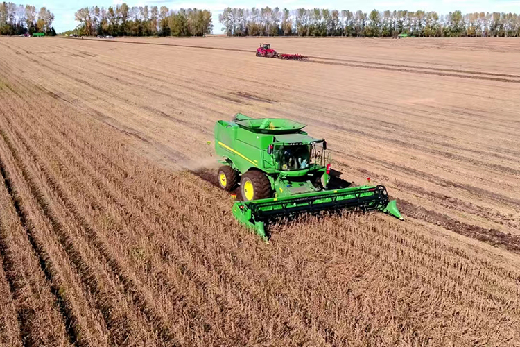 也正如老李說的,糧食豐產(chǎn)豐收,離不開農(nóng)業(yè)的科技支撐。在取得2023年全國農(nóng)墾提單產(chǎn)“大比武”優(yōu)勝農(nóng)場的基礎(chǔ)上,引龍河農(nóng)場有限公司黨委按照省委農(nóng)村工作會(huì)議、北大荒集團(tuán)、北安分公司備春耕生產(chǎn)工作推進(jìn)會(huì)議精神,以振興中國大豆產(chǎn)業(yè)為己任,落實(shí)落靠“穩(wěn)糧擴(kuò)豆”任務(wù),將大豆大面積單產(chǎn)提升作為農(nóng)業(yè)生產(chǎn)的主攻方向。2024年,這個(gè)農(nóng)場大豆一年“重茬”面積5.7萬畝,占大豆播種面積的18.23%;兩年“重茬”面積6.9萬畝,占大豆播種面積的21.91%;兩年以上“重茬”面積9.2萬畝,占大豆播種面積的29.22%。為更加有效應(yīng)對大豆重茬,農(nóng)場通過應(yīng)用重茬大豆提單產(chǎn)的各項(xiàng)措施,例如底肥增施生物有機(jī)肥和微生物菌肥,花期噴施大量元素水溶肥和微生物菌劑,大豆的產(chǎn)量有了非常明顯的提升,成熟度非常好,而且百粒重提高了1.5克,單數(shù)平均增加了1.9個(gè)莢數(shù)和3.48個(gè)粒數(shù)。與此同時(shí),還以深松為重點(diǎn),結(jié)合翻、耙、旋、起、壓等措施,提高整地質(zhì)量,打破板結(jié)層,增加土壤透氣性,奠定大豆播種基礎(chǔ),為大豆萌發(fā)和根系生長創(chuàng)造良好的土壤條件,并選擇土壤有機(jī)質(zhì)含量高地塊種植“重茬”大豆。合理安排大豆播種順序,先播種正茬大豆,待溫度回暖后再播“重茬”大豆,避免低溫冷量“重茬”病害的疊加。