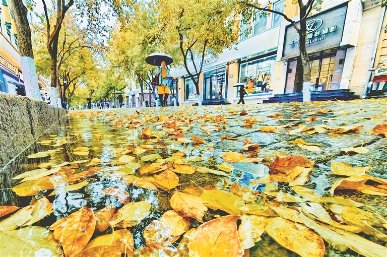 雨中秋意濃。10日一場(chǎng)秋雨,哈爾濱街道兩側(cè)的樹(shù)葉紛紛飄落,滿地落葉如同一層金色地毯,為秋日冰城增添了更多魅力。外出的人們撐起五顏六色的雨傘,走在落葉間,構(gòu)成了一幅幅美麗的油畫(huà)。