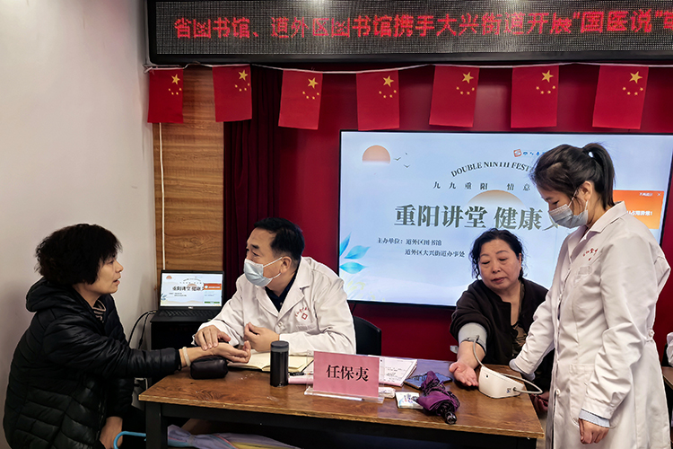 重陽(yáng)講堂 健康義診。大興街道辦事處攜手黑龍江省圖書館、道外區(qū)圖書館開(kāi)展“‘國(guó)醫(yī)說(shuō)’重陽(yáng)講堂健康義診”活動(dòng)。黑龍江省中醫(yī)藥科學(xué)院的專家教授為大家詳細(xì)地講解了預(yù)防三高的注意事項(xiàng)、三高人群的飲食禁忌等知識(shí),提高了大家對(duì)高血壓病的認(rèn)識(shí)。并為老年人把脈針灸、測(cè)量血壓,解答老年病防治等問(wèn)題,讓轄區(qū)老人足不出戶享受優(yōu)質(zhì)的醫(yī)療服務(wù),幫助他們提升健康素養(yǎng),營(yíng)造中醫(yī)藥傳承的文化氛圍。