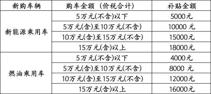 按《通知》要求,新補(bǔ)貼標(biāo)準(zhǔn)分為四檔。新購車輛為新能源乘用車的,發(fā)票金額在5萬元(不含)以下,每輛車補(bǔ)貼5000元;5萬元(含)至10萬元(不含),每輛車補(bǔ)貼10000元;10萬元(含)至15萬元(不含),每輛車補(bǔ)貼15000元;15萬元(含)以上,每輛車補(bǔ)貼18000元。新購車輛為燃油乘用車的,5萬元(不含)以下,每輛車補(bǔ)貼4000元;5萬元(含)至10萬元(不含),每輛車補(bǔ)貼8000元;10萬元(含)至15萬元(不含),每輛車補(bǔ)貼12000元;15萬元(含)以上,每輛車補(bǔ)貼16000元。
