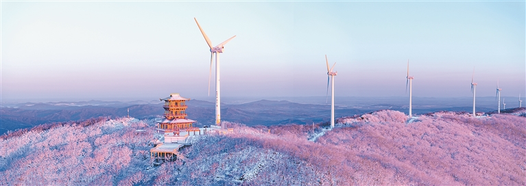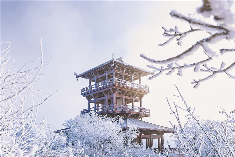 山林間云霧彌漫,白雪和蒼勁的虬枝映襯,山頂?shù)奶煊娱w和一個(gè)個(gè)白色巨人般的發(fā)電“風(fēng)車”相映成趣,將這座名山裝扮得更加素雅、更顯活力。近處,松柏全都凝霜掛雪,戴銀披玉。山頂原始次森林中,低矮的灌木叢也被積雪覆蓋,成為了一朵朵五彩的冰花。高大的樹木被輕盈的雪花點(diǎn)綴,晶瑩剔透,仿若玉樹瓊枝,隨風(fēng)搖擺,宛如仙境。