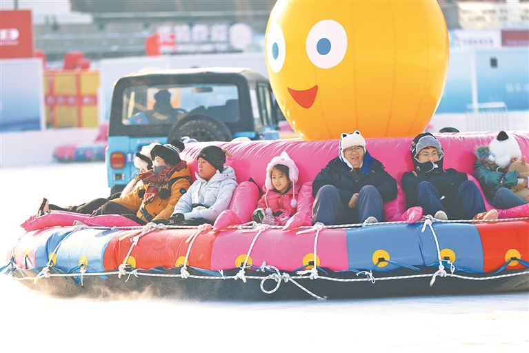 記者站在堤壩望向松花江面看到,江面被有序劃分為多片區(qū)域,每片區(qū)域都是一個歡樂場,游客可以體驗“瘋狂八爪魚”、大滑梯、龐巴迪賽車、滑冰,乘坐馬車、冰雪龍舟游覽園區(qū),還可以走進(jìn)“馴鹿部落”體驗喂食馴鹿的樂趣。同時,熱飲屋、文創(chuàng)店、寄存處、餐飲店、防寒用品攤位等相關(guān)配套服務(wù)一應(yīng)俱全。