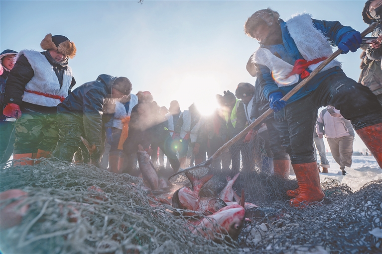 最具儀式感的冬捕祭祀儀式無疑是本次活動(dòng)的重頭戲之一。在魚把頭的帶領(lǐng)下,漁民們遵循古老傳統(tǒng),祈求庇佑、漁業(yè)豐收,隨著漁民收網(wǎng),網(wǎng)中的大魚逐漸顯露出湖面。