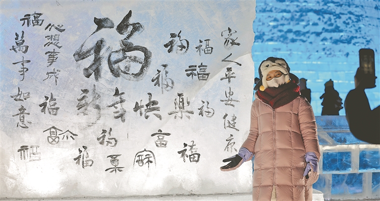 1月16日,為喜迎乙巳蛇年的到來,哈爾濱冰雪大世界在園區(qū)打造一座許愿冰墻,上面寫滿各種祝福,為新年增添喜氣。