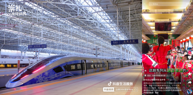 在線下,活動(dòng)還聯(lián)動(dòng)崇禮區(qū)政府、延邊州商務(wù)局、齊齊哈爾網(wǎng)信辦落地雪國(guó)專(zhuān)列,覆蓋復(fù)興號(hào)、民俗專(zhuān)列、高鐵站等不同場(chǎng)景,讓游客和市民感受濃濃冰雪氛圍,自發(fā)為當(dāng)?shù)匚穆梅N草,吸引更多雪友來(lái)到小城看見(jiàn)好風(fēng)光。截至活動(dòng)收官,“開(kāi)往崇禮站的雪國(guó)專(zhuān)列”熱度達(dá)827萬(wàn),一度登上抖音河北多地同城榜TOP1。