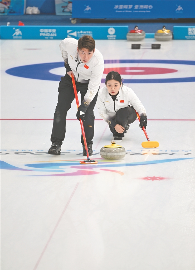 在6日上午進(jìn)行的冰壺混雙第六輪比賽中,中國隊(duì)王智宇/韓雨組合在現(xiàn)場觀眾的歡呼聲中,以6比4拿下了強(qiáng)勁的韓國隊(duì)。