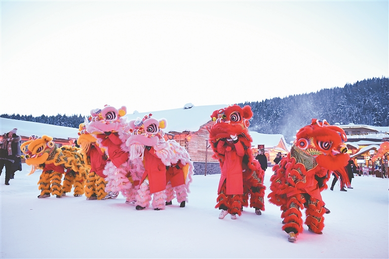 廣州南獅走進(jìn)雪鄉(xiāng)。本報(bào)記者 李健攝