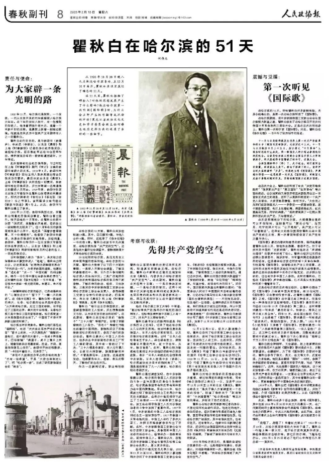 在哈爾濱的51天,帶給瞿秋白許多新鮮體驗(yàn),尤其令他難忘的,是第一次在哈爾濱聽到了《國際歌》。