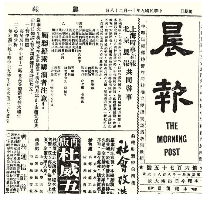 1920年11月28日至12月16日,北京《晨報(bào)》和上?!稌r(shí)事新報(bào)》頭版頭條的《共同啟示》:“兩報(bào)特派記者俞頌華、瞿秋白、李宗武前往蘇俄采訪?!?/span>