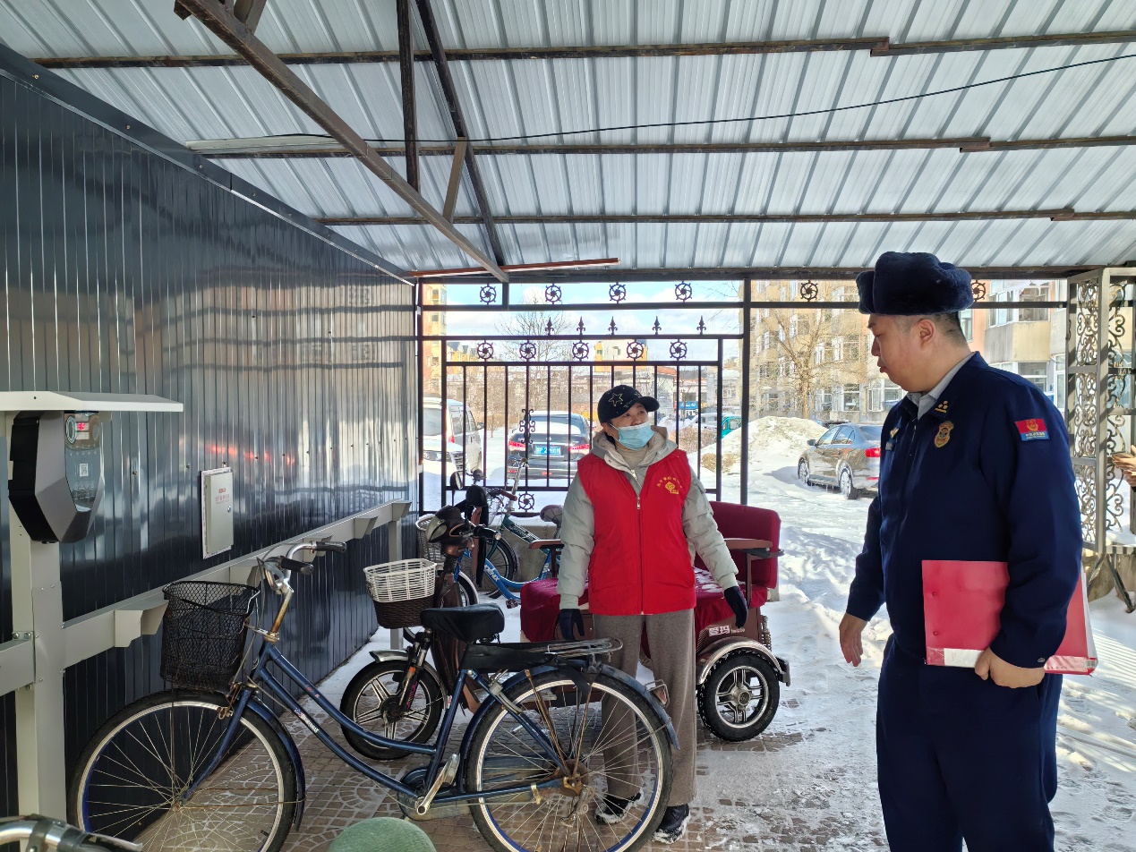 塔河縣消防救援大隊工作人員聯(lián)合社區(qū)網(wǎng)格員對轄區(qū)電動車消防安全隱患進(jìn)行排查(胡春磊 攝)