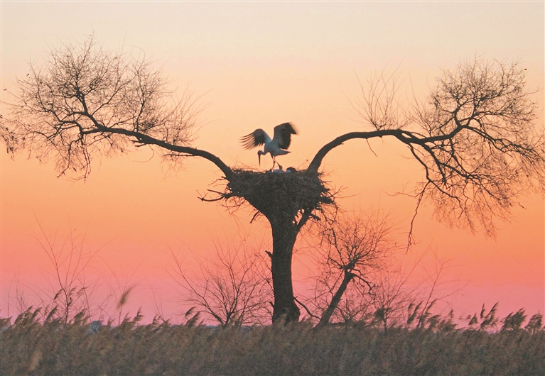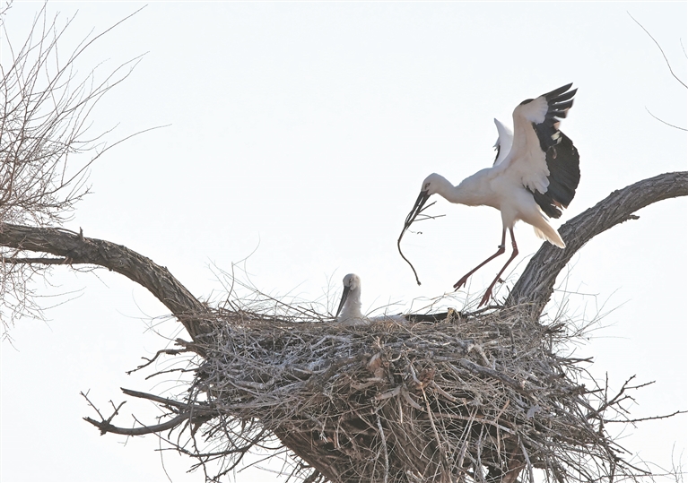 圖為東方白鸛筑巢孵卵。本報記者 郭俊峰攝