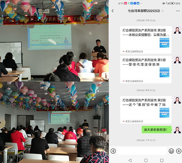 在此次打擊“代理退?!毙麄骰顒又?,七臺河中支利用微信工作群、微信朋友圈轉(zhuǎn)發(fā)宣傳內(nèi)容,詳細(xì)剖析了黑灰產(chǎn)的常見運(yùn)作模式,非法“代理退保”可能給消費(fèi)者帶來的四方面風(fēng)險:一是資金受損風(fēng)險;二是喪失正常保險保障的風(fēng)險;三是個人信息泄漏風(fēng)險;四是相關(guān)行為可能導(dǎo)致消費(fèi)者面臨訴訟等法律風(fēng)險。號召廣大群眾增強(qiáng)風(fēng)險防范意識,警惕非法“代理退?!碧茁?。