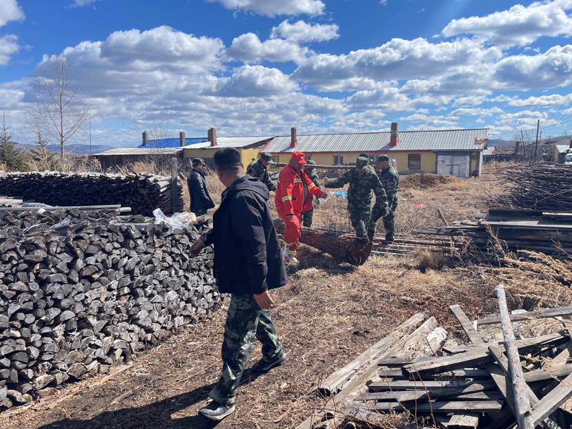 碧洲林場黨員干部職工在運(yùn)送固定房頂木材(趙玉鵬 攝)