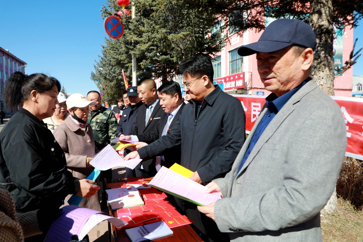 阿木爾林業(yè)局聯(lián)合宣傳小組向居民散發(fā)宣傳單,宣傳國(guó)家安全的重要性(王力 攝)