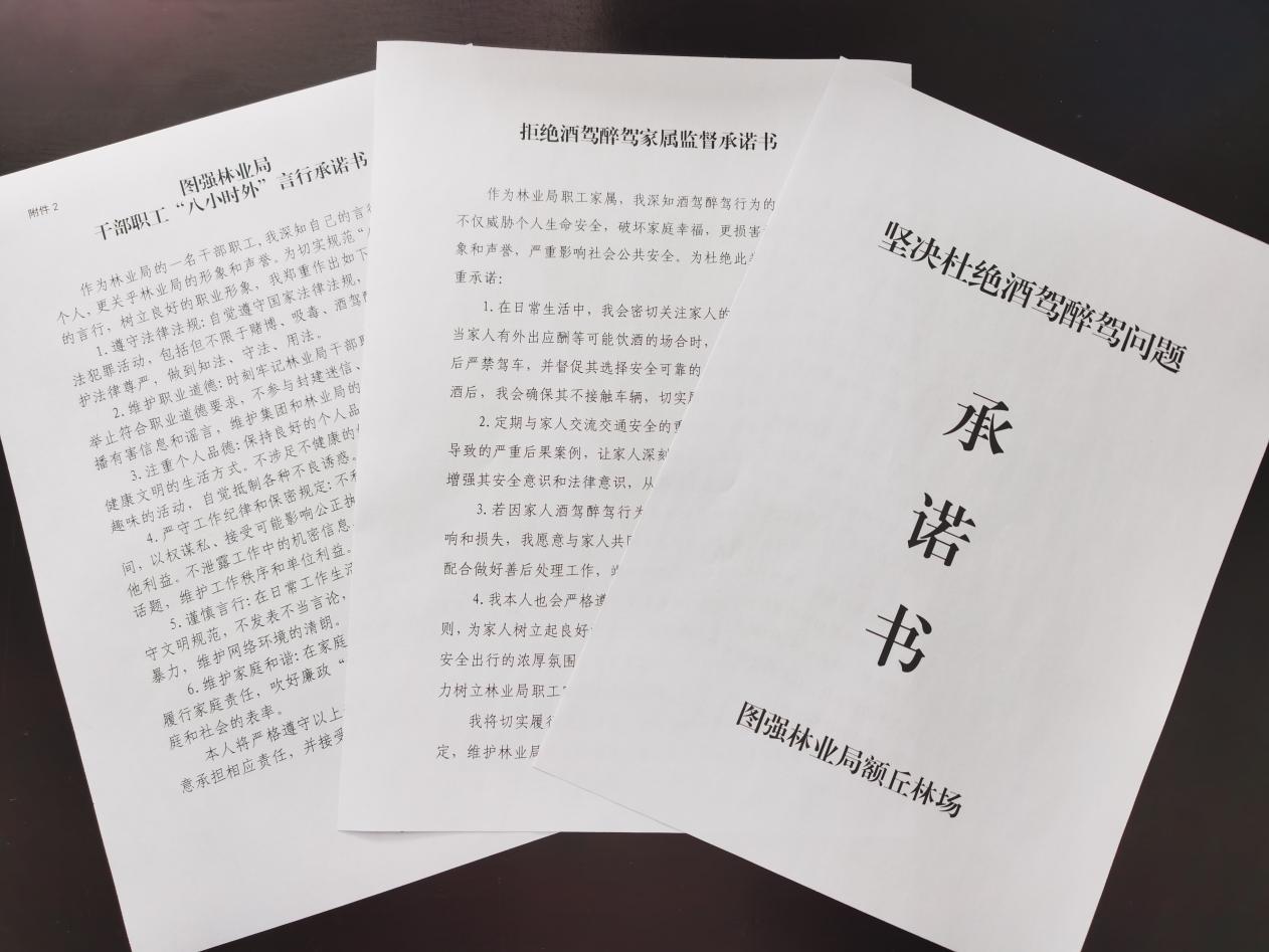 加強日常監(jiān)督,扭緊敬畏法紀“總開關”。林場將酒駕醉駕工作納入紀律作風建設和日常監(jiān)督管理的重要內(nèi)容,組織干部職工簽訂《拒絕酒駕醉駕承諾書》、《拒絕酒駕醉駕家屬監(jiān)督承諾書》和《“八小時外”言行承諾書》。定期與職工家屬溝通聯(lián)系,共同約束職工“八小時以外”的言行舉止,形成單位管控、同事監(jiān)督、親屬約束的防范合力。