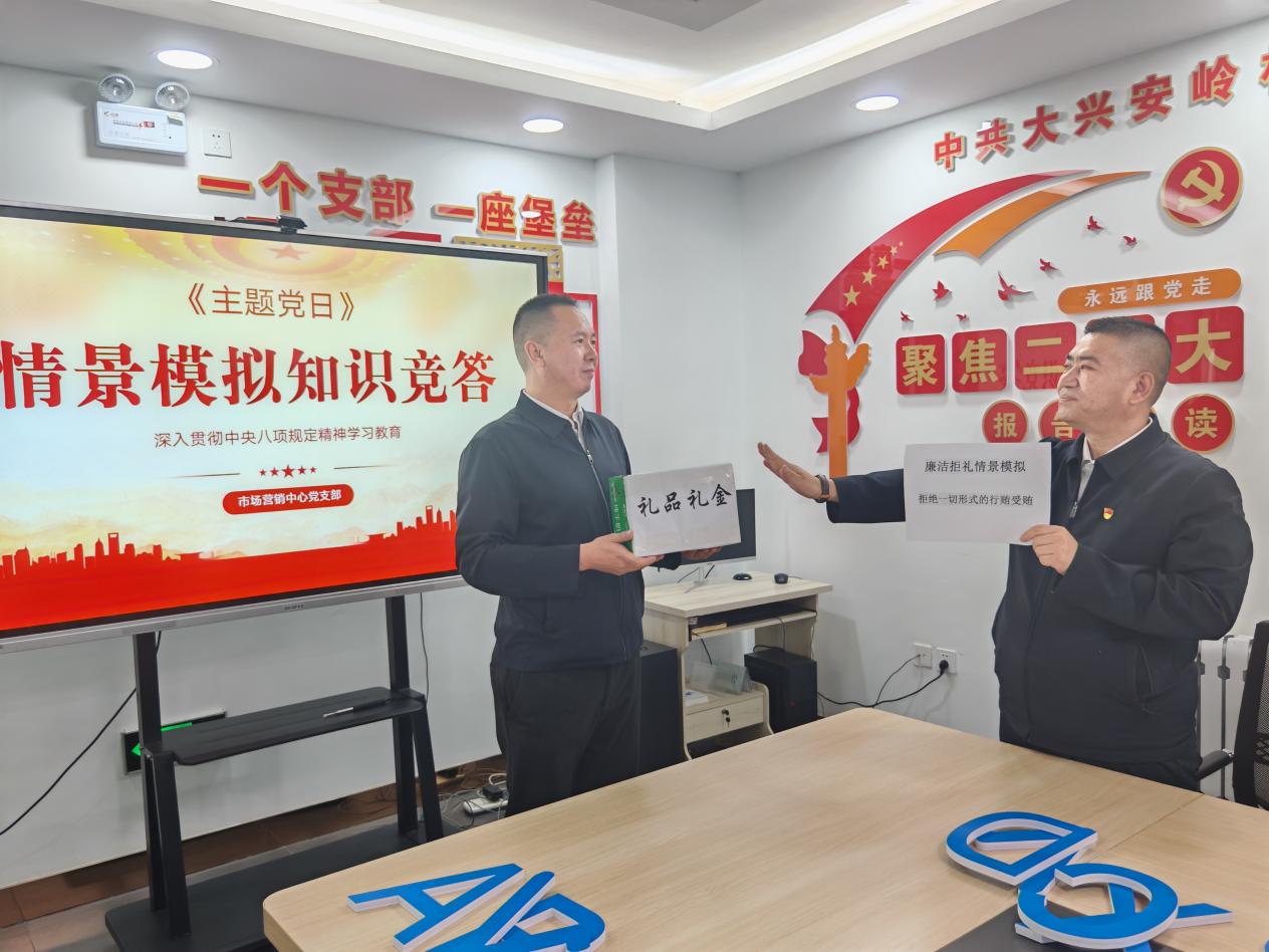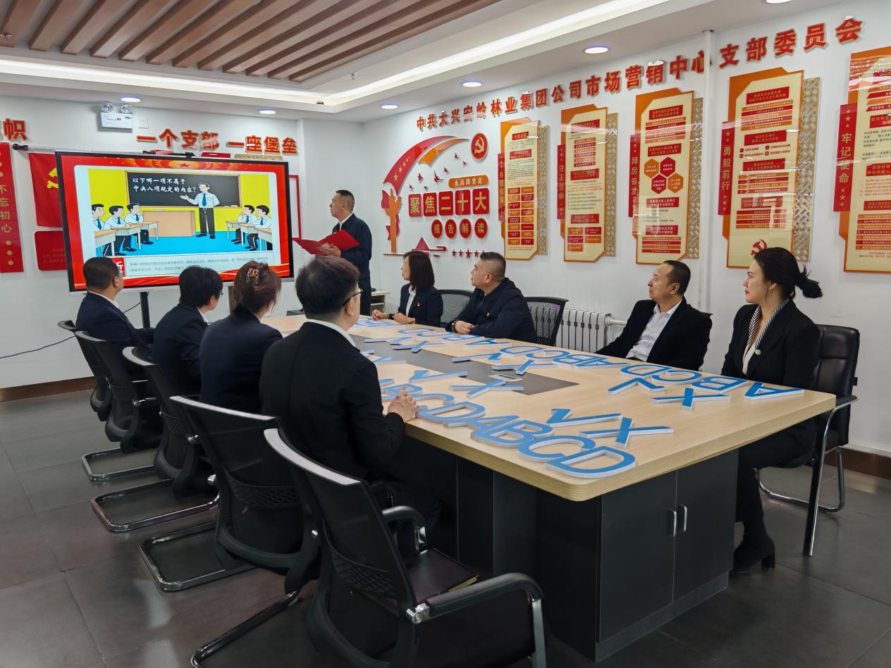 黑龍江經(jīng)濟(jì)網(wǎng)訊(劉妍 記者馬朝林)為積極響應(yīng)黨對紀(jì)律建設(shè)的高度重視,持續(xù)推動黨員干部深入學(xué)習(xí)中央八項規(guī)定精神,大興安嶺林業(yè)集團(tuán)公司市場營銷中心于近日巧妙結(jié)合支部主題黨日活動,嚴(yán)格依照 “三會一課”要求,精心策劃并開展了一場獨具匠心的學(xué)習(xí)貫徹中央八項規(guī)定情景模擬知識競答學(xué)習(xí)交流活動。