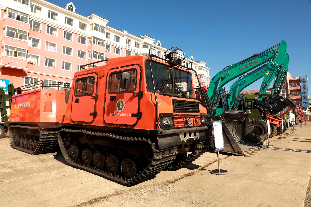 在大型裝備車輛展前,一臺臺嶄新的推土機、裝載機、拓荒機、液壓樹剪車、“全地豹”全地形車、“蟒式”全地形車、西瓜虎水陸兩棲車、輪式越野消防車等大型機械設備集中亮相,吸引了眾多居民參觀。