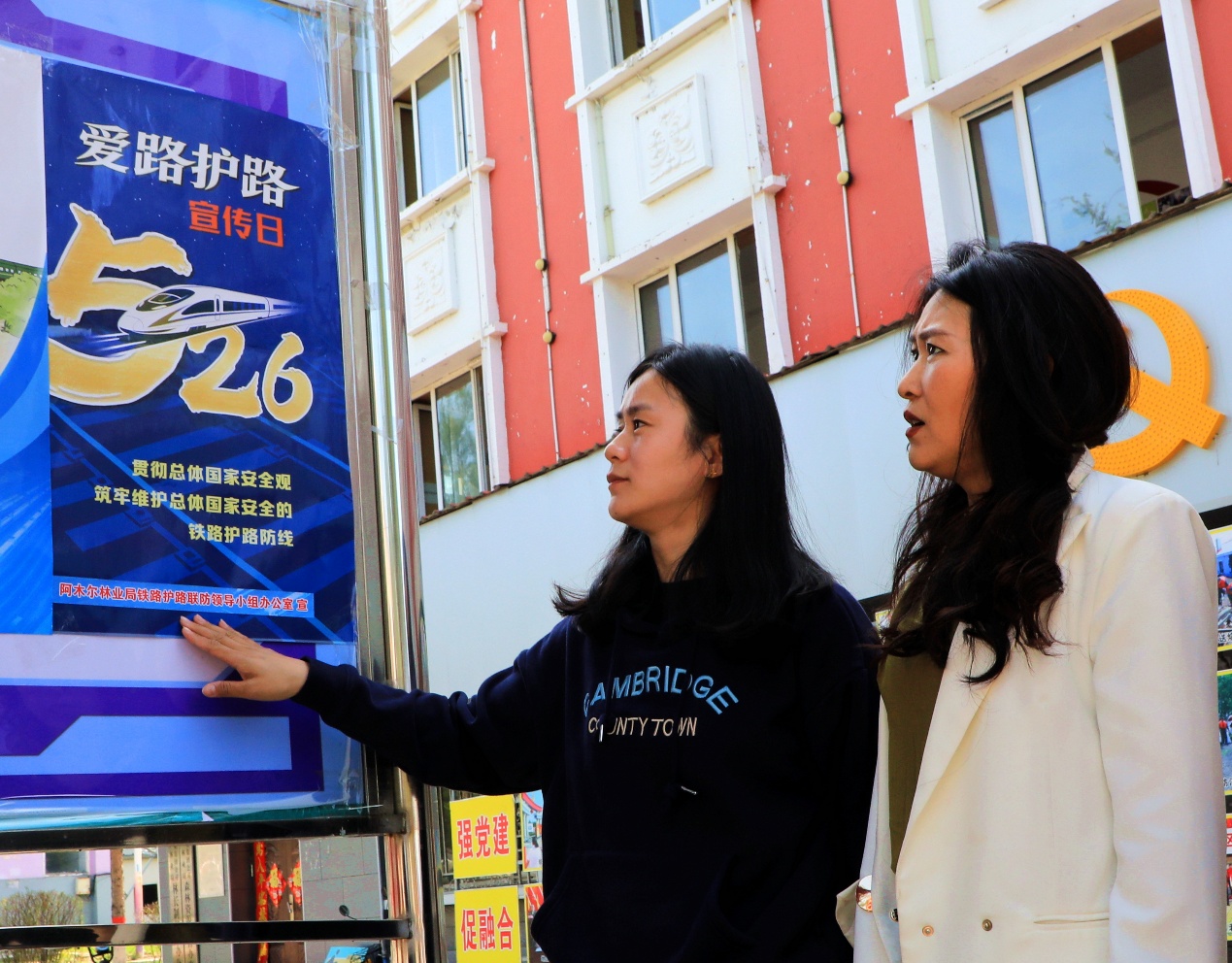 阿木爾社區(qū)工作人員通過(guò)宣傳海報(bào),了解5.26愛(ài)路護(hù)路宣傳日相關(guān)知識(shí)(王力 攝)