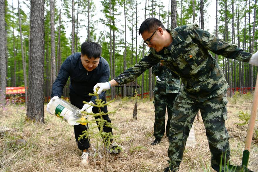 植樹活動現(xiàn)場職工在為栽好的樹苗澆水(圖片由新林林業(yè)局黨委宣傳部提供)