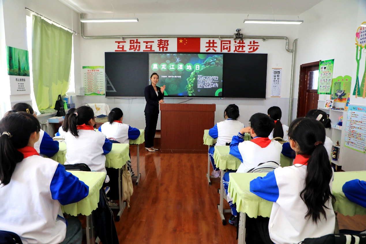 阿木爾國家濕地公園工作人員走進(jìn)阿木爾中小學(xué),向小學(xué)生普及濕地保護(hù)知識,播種愛護(hù)種子(王力 攝)