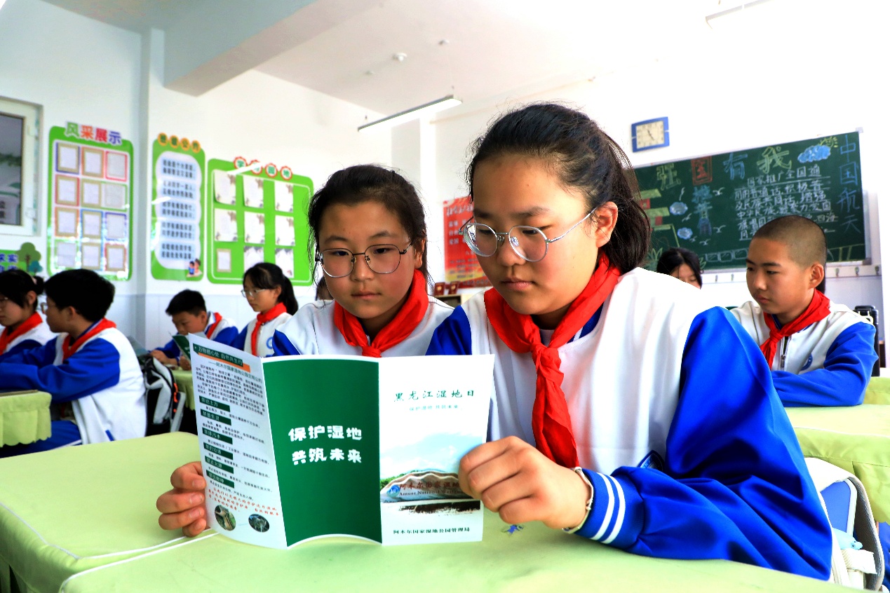 阿木爾中小學(xué)學(xué)生通過《黑龍江濕地日》宣傳冊,認(rèn)真學(xué)習(xí)濕地保護(hù)相關(guān)知識(王力 攝)