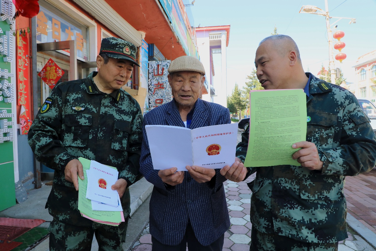 阿木爾林業(yè)局聯(lián)合宣傳小組成員向居民以通俗易懂的語言,提升居民保護(hù)濕地的法律意識(王力 攝)