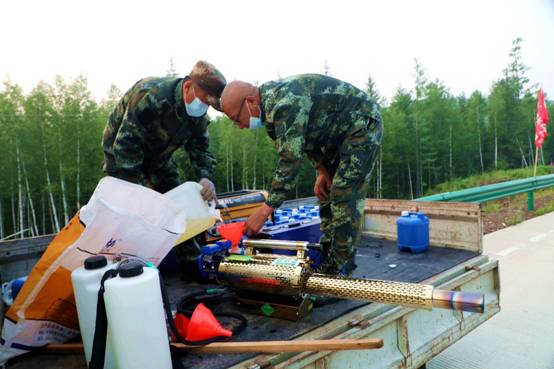 共產(chǎn)黨員、阿木爾林業(yè)局長(zhǎng)山林場(chǎng)職工王祥志配合林業(yè)局防治站,準(zhǔn)備燃放煙劑,防治落葉松落葉?。ㄍ趿?攝)