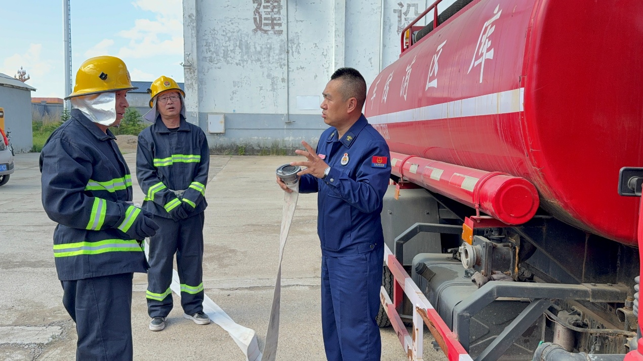 大隊(duì)宣傳員在向糧庫(kù)員工講解水帶的使用與養(yǎng)護(hù)(孫珍珍 攝)