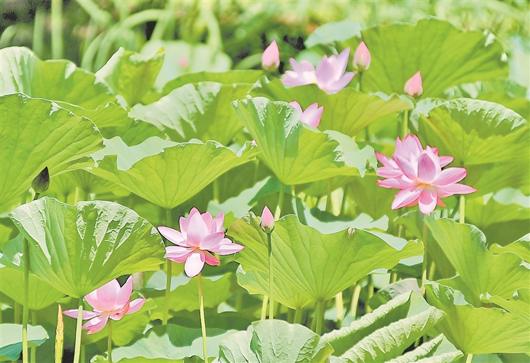 7日迎來小暑節(jié)氣,此時節(jié)也正是荷花盛放之時。哈爾濱市道里區(qū)雨陽公園內(nèi),碧綠的荷葉鋪滿池塘,含苞待放的花蕾在風(fēng)中搖曳,粉色的荷花競相綻放。
