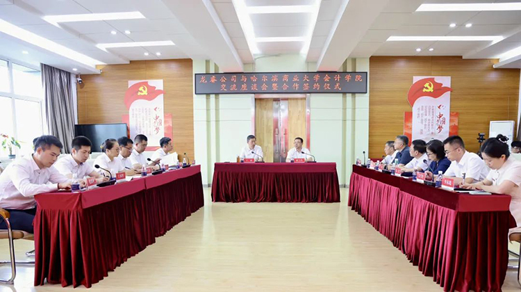 活動中,王彬、趙大偉共同為“產(chǎn)教融合聯(lián)合培養(yǎng)單位”揭牌。龍睿公司黨委委員、總會計師劉躍剛,哈爾濱商業(yè)大學(xué)會計學(xué)院院長梁運吉代表雙方簽署了《戰(zhàn)略合作協(xié)議》及《財務(wù)人員兩年培養(yǎng)工程計劃合作協(xié)議》。