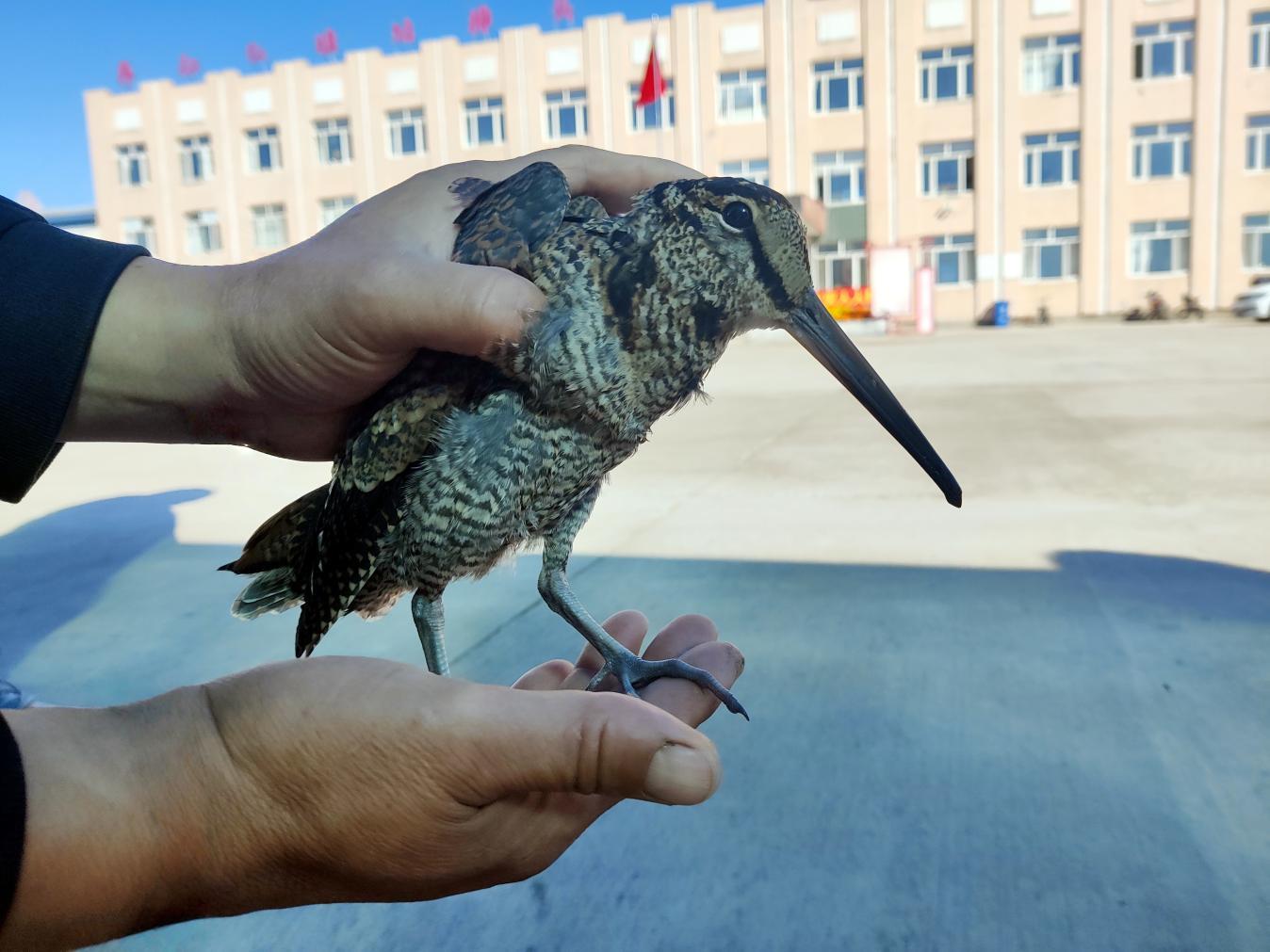 “一開始還以為是躲在草里的野雞,走近了才發(fā)現(xiàn),是只從沒見過的水鳥。”周明海放緩腳步,輕輕蹲下身,在晨光中看清了這只鳥的模樣——纖細修長的喙,灰褐色的羽毛上布滿了細密的斑紋,最顯眼的是那只始終無法伸展的右翼。他屏住呼吸,小心翼翼地伸出手,將這只約半公斤重的鳥兒捧在掌心,“能感覺到它的爪子還在輕輕抓我的手心,但沒怎么掙扎,看樣子是受傷沒力氣了?!?/p>