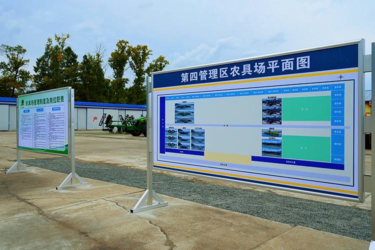 走進(jìn)引龍河農(nóng)場(chǎng)第四管理區(qū)的農(nóng)機(jī)具停放場(chǎng),首先映入眼簾的是《農(nóng)具場(chǎng)擺放平面圖》,不同顏色的線條清晰標(biāo)注著拖拉機(jī)區(qū)、收獲機(jī)區(qū)、農(nóng)具存放區(qū)的位置。