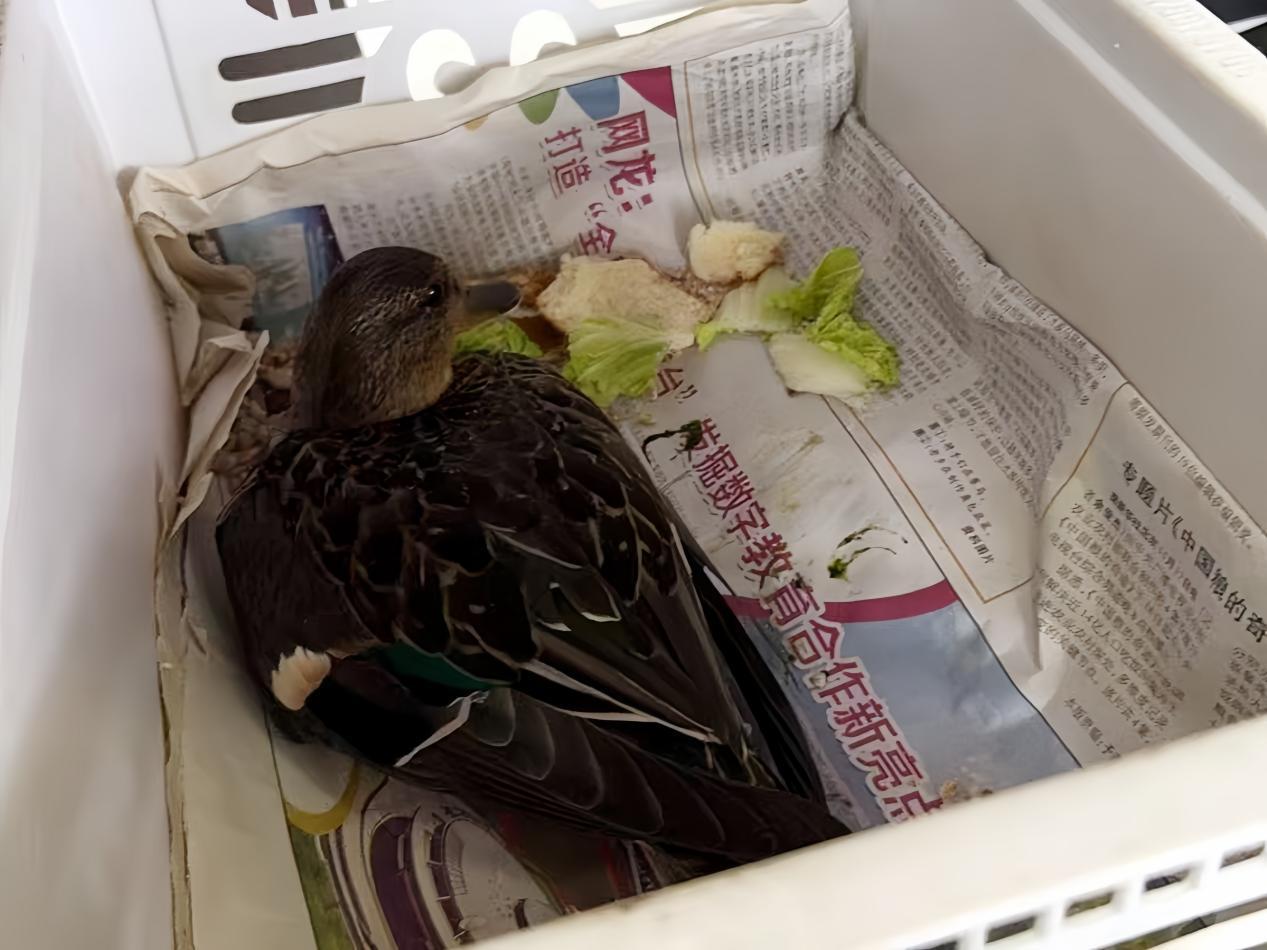 大烏蘇林場防火宣傳車在鹿苑山莊周邊巡護時,工作人員發(fā)現(xiàn)路邊草叢中有疑似受傷動物。下車查看后,確認是一只行動遲緩、無法正常飛行的幼鳥。為防止其二次受傷,工作人員當即在現(xiàn)場設置簡易防護措施,將其帶回林場辦公室。并第一時間聯(lián)系新林區(qū)林業(yè)和草原局技術人員,經(jīng)過鑒定后,該幼鳥為國家二級保護動物綠頭鴨,經(jīng)檢查,其翅膀受傷骨折,已喪失正常飛行能力。目前,這只被救助的綠頭鴨已移交至新林區(qū)林業(yè)和草原局接受進一步治療,待康復后將放歸大自然。
