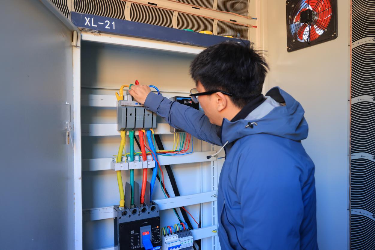 “這是一套完全獨立的孤島型微電網(wǎng),它不與大電網(wǎng)相連,通過自主發(fā)電與儲能實現(xiàn)供電。我們配置了150千瓦光伏陣列、兩臺10千瓦風力發(fā)電機組,并配套低溫適配型儲能電池及保溫系統(tǒng),同時搭載了協(xié)調(diào)運行與能量管理系統(tǒng),可實現(xiàn)24小時連續(xù)、穩(wěn)定供電?!惫枮I工業(yè)大學電氣工程及自動化學院博士研究生周洋介紹。